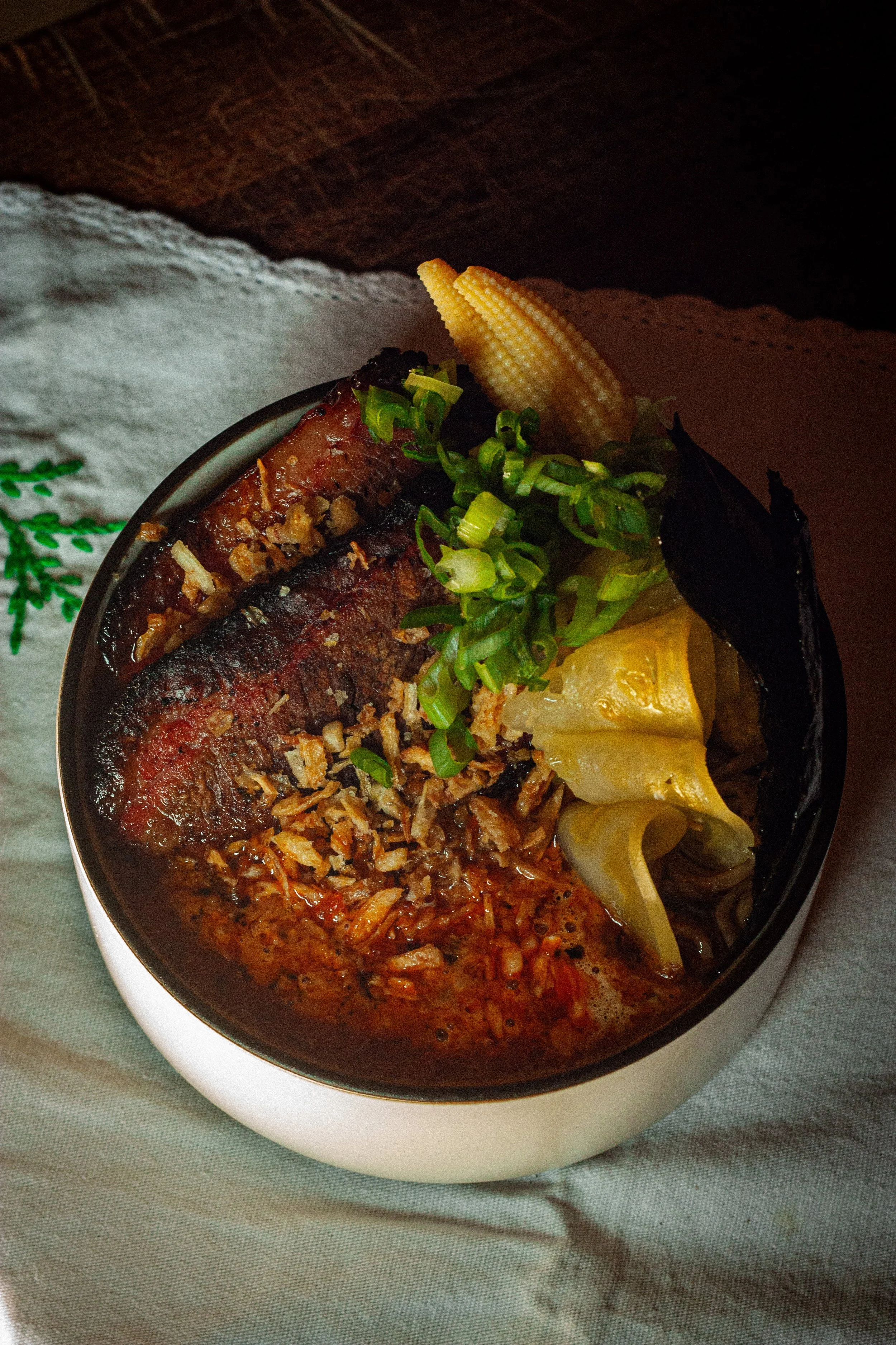 Black garlic and pork soup with black vinegar glazed pork belly, house chili crisp, boc choy and marinated egg; served with our buckwheat noodles