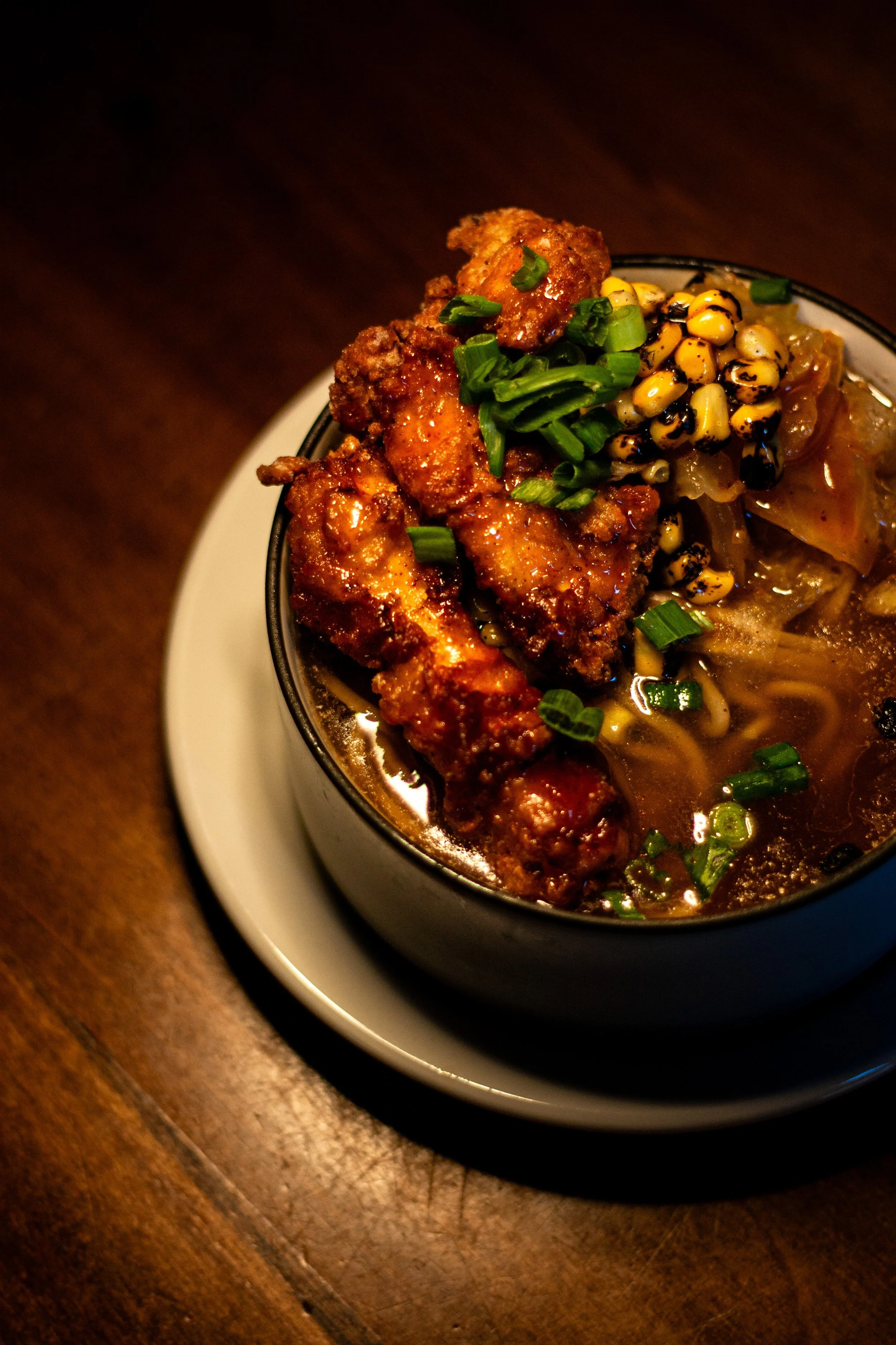 Chicken Chintan with buttermilk fried chicken, hot honey, green tomato chow and torched corn; served with our buckwheat noodles