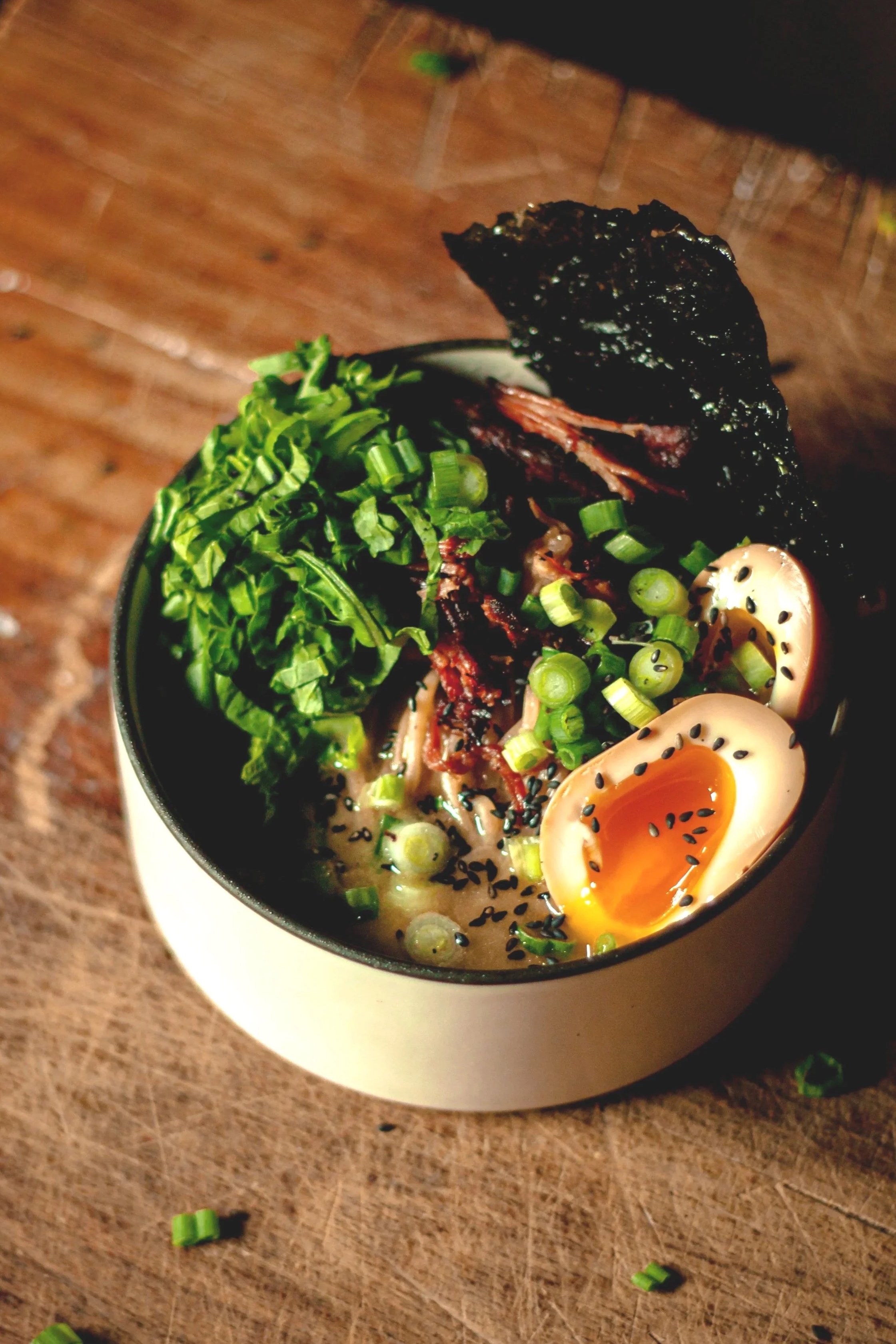 A 48 hour white tonkotsu soup with shio tare, yuzu pulled pork, mustard greens, black sesame and a marinated egg; served with our buckwheat noodles