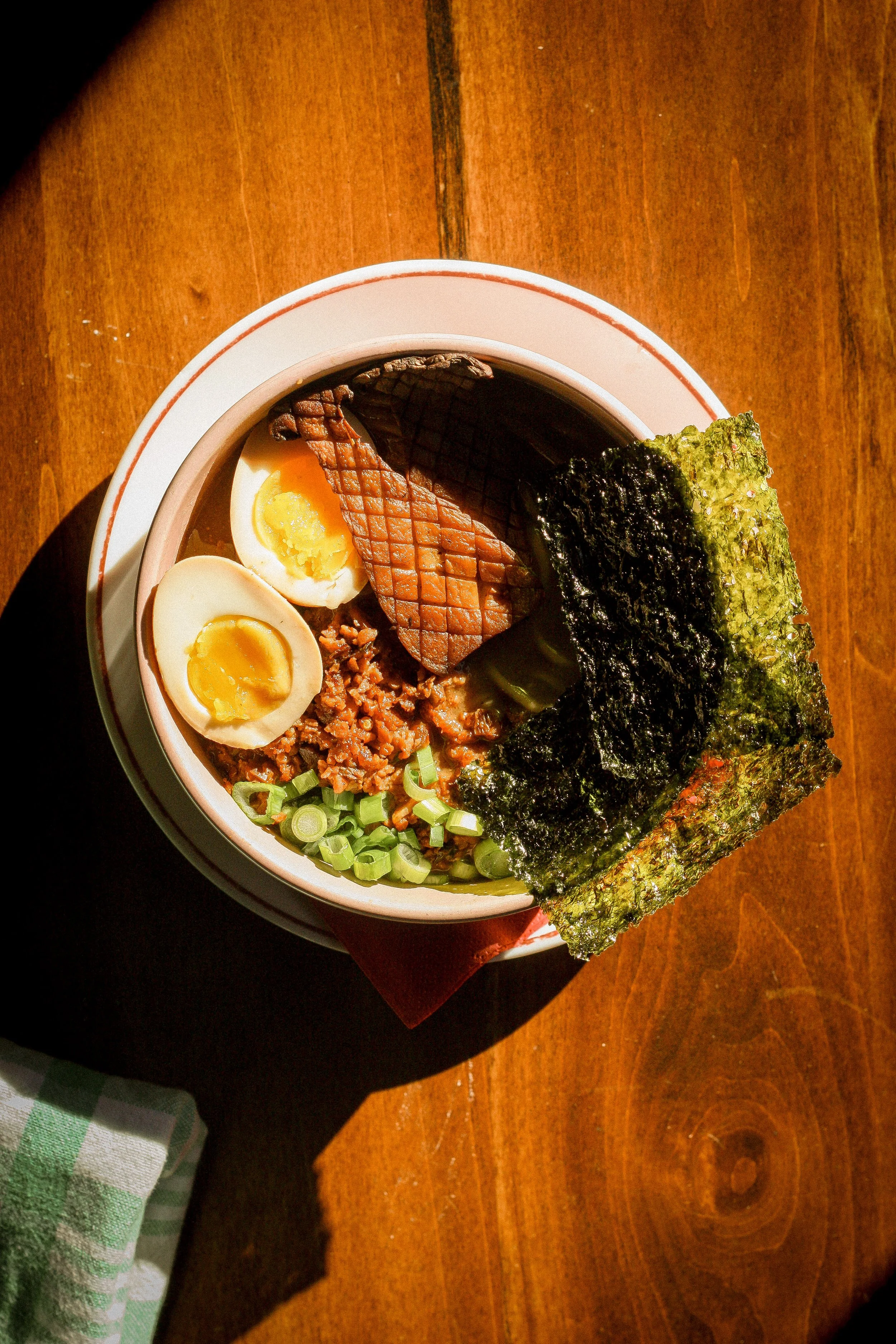 A vegetarian shiitake and double miso soup with soy and mushroom ragout, green onions, enoki mushroom and a marinated egg; served with our buckwheat noodles